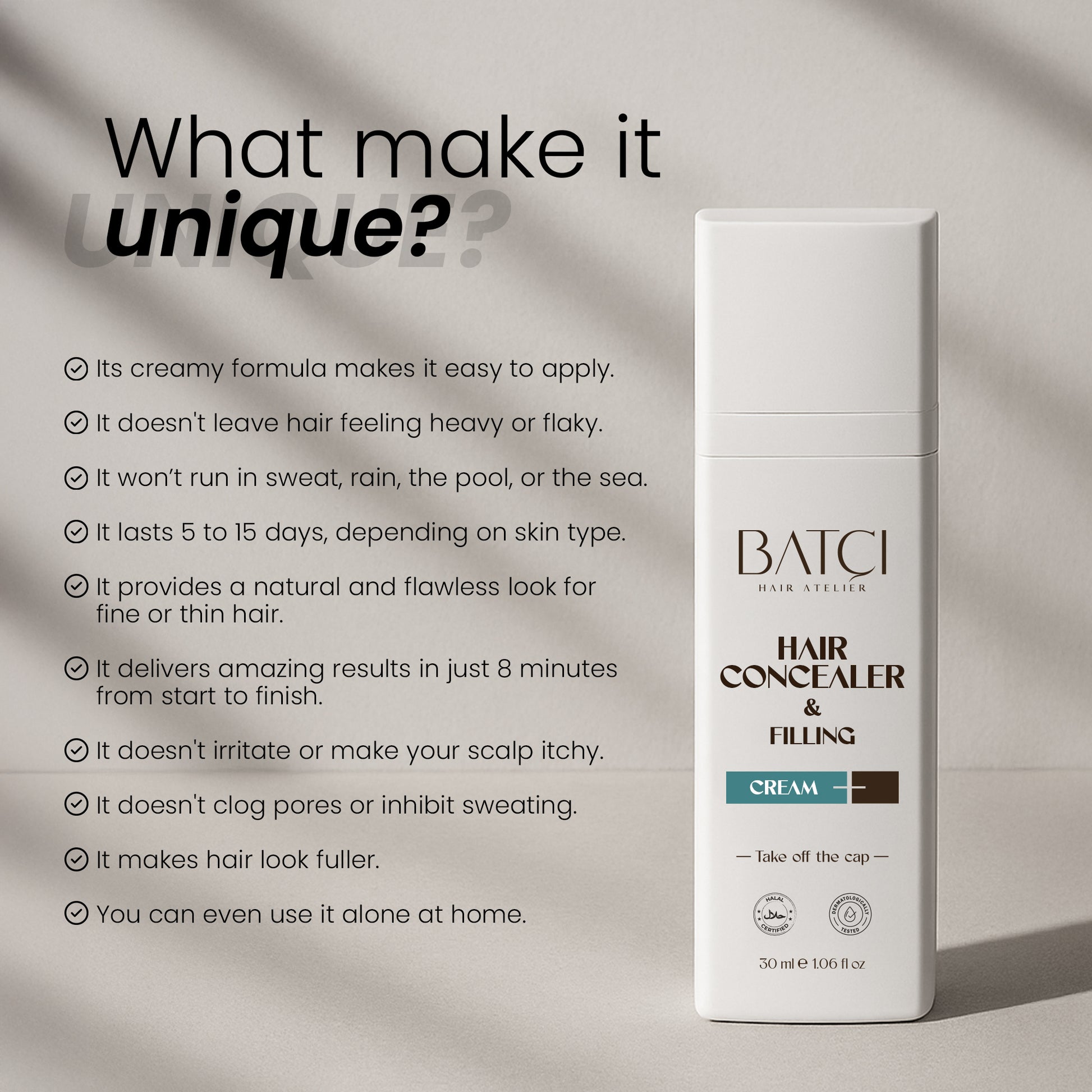 Heb je fijn of dunner wordend haar? BATCI Cream Hair Concealer biedt een natuurlijke oplossing met een langdurig effect. Het is gemakkelijk aan te brengen op dunner wordende plekken en blijft 5 tot 15 dagen zitten, afhankelijk van je huidtype en hoe je het gebruikt. Het loopt niet uit onder de douche, in het zwembad of zelfs in de zee.